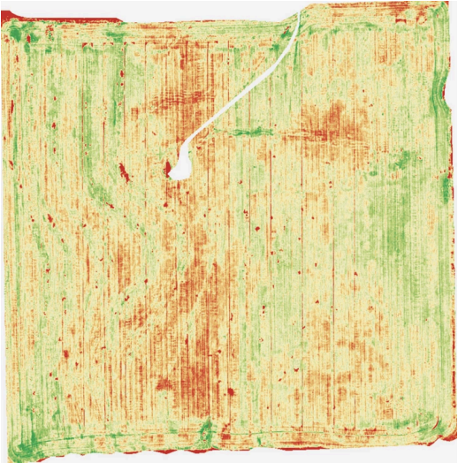 Figure 1: Smart Sprayer Mapping. This rectangular image of green, yellow, and red is what the drones/satellites provide for the farmers and give back to the sprayers. The red/orange areas are the places that need pesticides to help kill weeds, or need chemicals to help the agriculture grow. These maps ensure that the amount of pesticides being sprayed are only hitting the areas and releasing the amounts